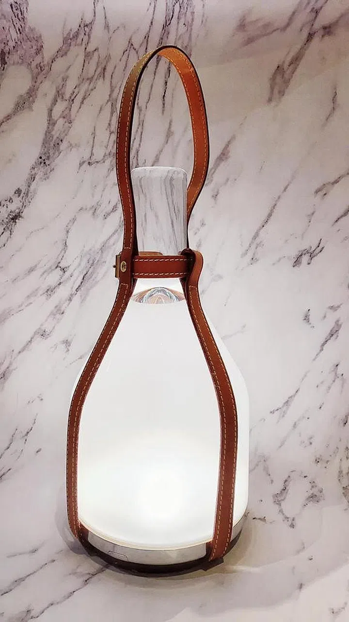 在路易威登Objets Nomades系列中,设计师二人组Edward Barber与Jay Osgerby将现代技术与传统知识相结合,创造了钟形台灯。经手工打磨、裹有Nomade皮带的磨砂玻璃“钟”,引人注目。内置的可调光LED灯可在不充电的情况下提供长达30小时的光照。纯正的“游牧风”配件,让明亮优雅的光线飘向四方。严格来说这虽不算是时尚配件,但Jeffrey偏爱这件艺术品的别致设计感和轮廓。