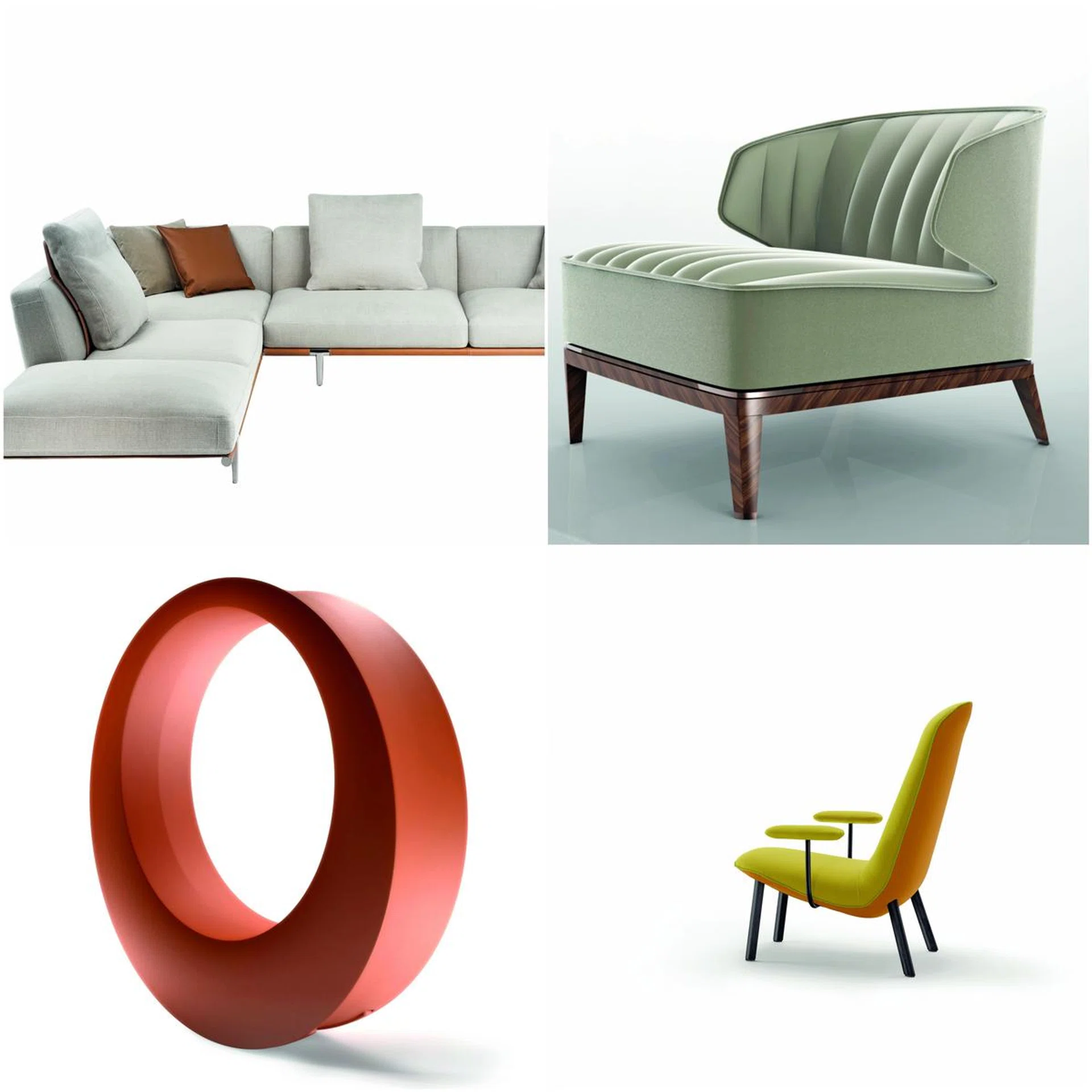 Roberto Lazzeroni 为 Poltrona Frau设计的Fidelio桌子,以及 Jaime Hayon 为Arflex设计的 Arcolor 茶几,则是结合木料与大理石。Ludovica 和 Roberta Palomba 双人组合为 Poltrona Frau设计的 Let It Be 沙发,以及 La Conca 为 Visionnaire 设计的Blondie 扶手椅,皮革、木料与金属齐上阵。