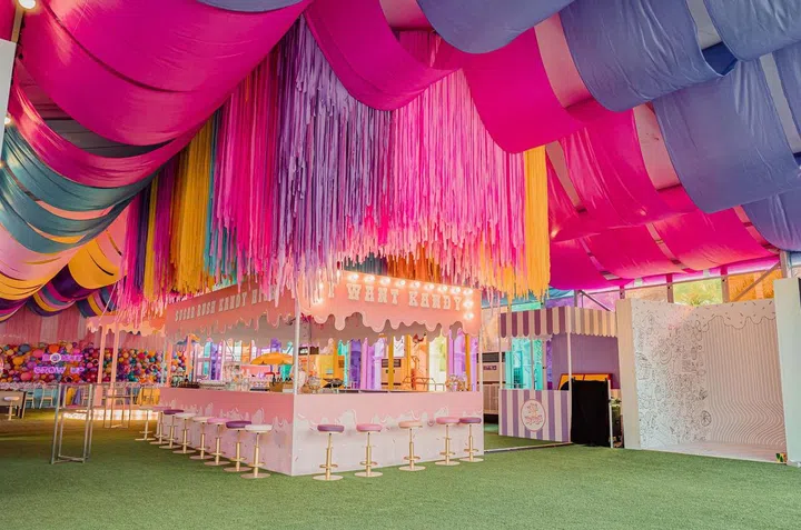 整个室内嘉年华都以上万个气球点缀,四周添置了不同游戏站,包括现代和传统游戏,还有一个巨型的儿童版娃娃机。会场中央是一个巨型DJ台,Kim邀请好友DJ Chris为嘉年华选播音乐。当然也少不了许多孩子们喜爱的甜点站。这场嘉年华由The Wedding Atelier 一手策划,费时10天打造。