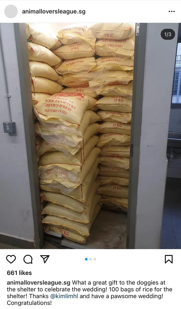 据了解,为了庆祝这大喜之日,新人也同时在这天捐赠了100包狗粮给流浪狗之家Animal Lovers League慈善机构。另外在注册典礼上所用的花,之后都重新包装,送给李亞妹安老院的老人们,跟他们一起分享新人的喜悦。同时,新人也把之前 “过大礼”聘礼中的罐头干粮等送给不同的慈善机构,喜善双庆。