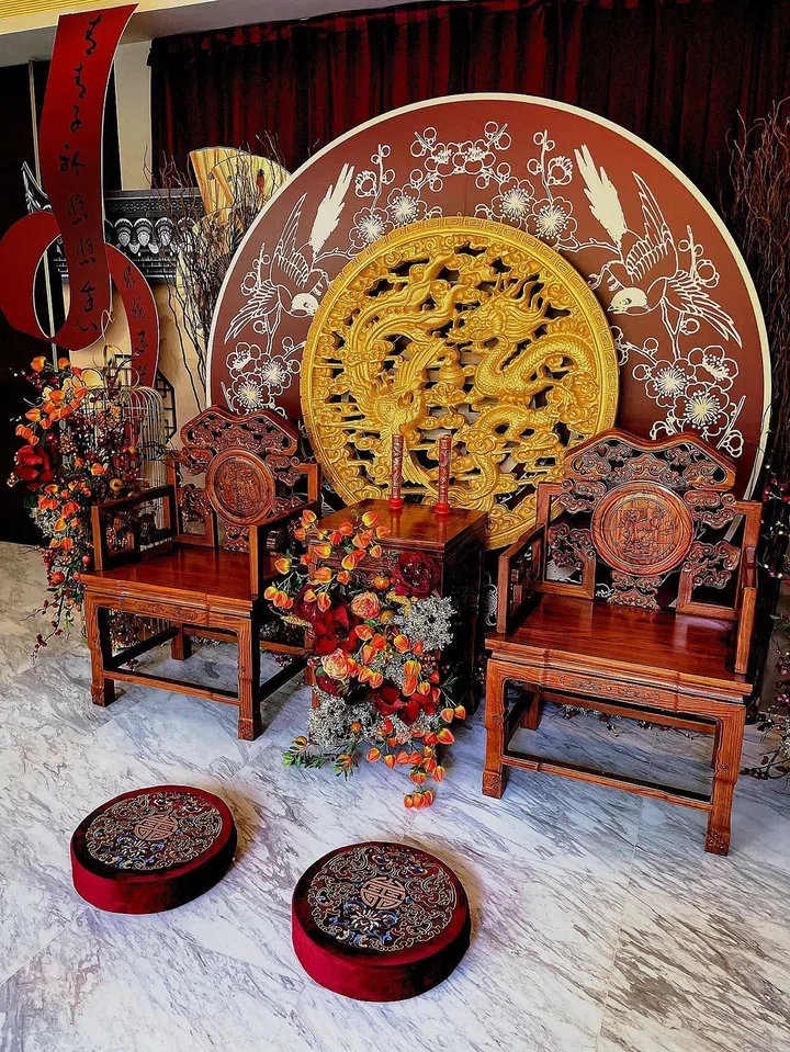 Kim当天穿上了一件全白的Vera Wang 礼服。她之后穿上了订制的传统大红五福龙凤褂,戴上了巨型项链和7对龙凤镯,头上戴着一对全金小皇冠,俨然一个小公主,男方则穿上了订制囍袍。整个敬茶仪式的布景极为讲究,无论是在南方或女方家里的背景都有一面传统拼缝。据了解,敬茶仪式的装饰是由Bloom House Events 负责。父亲林荣福在喝了女婿茶后,送上大红包,Kim看后立刻飙泪。红包内是一张早在2014年就停发面额一万元的旧纸钞还有一张纸条上写着 “这张特别的钞票跟随着爸爸很多年,也陪我度过了好多艰难的岁月。好好的珍惜它,祝你们俩人生美满。2022年2月22日。爸”
