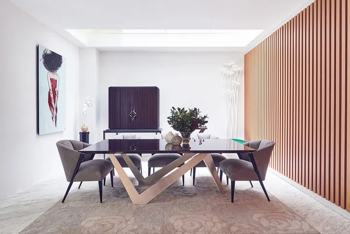 饭厅的主角是大型Santiago I 餐桌,独特的风筝形桌脚设计向以桥梁结构闻名的已故建筑大师Santiago Calatrava致敬。摆放在角落处的高背椅Le Jardin-Gouche也是吸睛品,这款设计独特的椅子是Christopher Guy向香奈儿女士献上的精心设计,以桃心花木手工雕刻成一朵朵山茶花,精致又高雅。