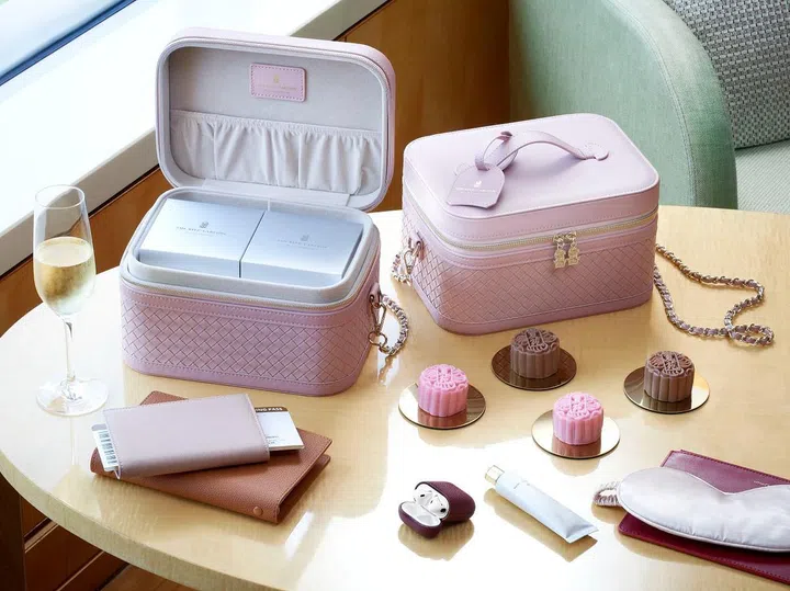 丽思卡尔顿美年酒店(The Ritz-Carlton, Millenia Singapore)的月饼由酒店中餐馆夏苑和酒吧Republic联合制作,两款迷你冰皮月饼新品是荔枝丁尼和爱尔兰咖啡丁尼($98,各四个),后者灵感来自Republic的新鸡尾酒。烘皮月饼和冰皮月饼装在浅蓝色或粉红色化妆盒包内,盒子外壳是高贵皮革编织,内部全天鹅绒布,有双隔层和弹性内袋,搭配一个丽思卡尔顿行李牌及一条肩链,可以直接当包包拎着。