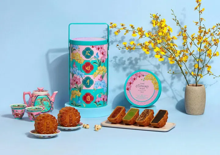 新加坡富丽敦海湾酒店(The Fullerton Bay Hotel Singapore)为庆祝克里福码头(Clifford Pier)90周年,特别推出“The Clifford Pier Mooncake Tingkat”月饼礼盒,有五仁沙爹酱(Mixed Nuts with Satay Peanut Sauce Baked Mooncake)、辣虾米酱(Salted Lotus with Hae Bee Hiam Baked Mooncake)、香芒亚参酱(Assam Lotus with Mango Baked Mooncake)和香兰椰丝煎蕊(Pandan Coconut with Chendol Baked Mooncake)口味,带有本地美食色彩。提盒月饼以复古铁质圆筒为造型,淡蓝色的4层餐盒配上“花好月圆”4个字以及胡姬花和蝴蝶图案,向我们的花园城市致敬。
