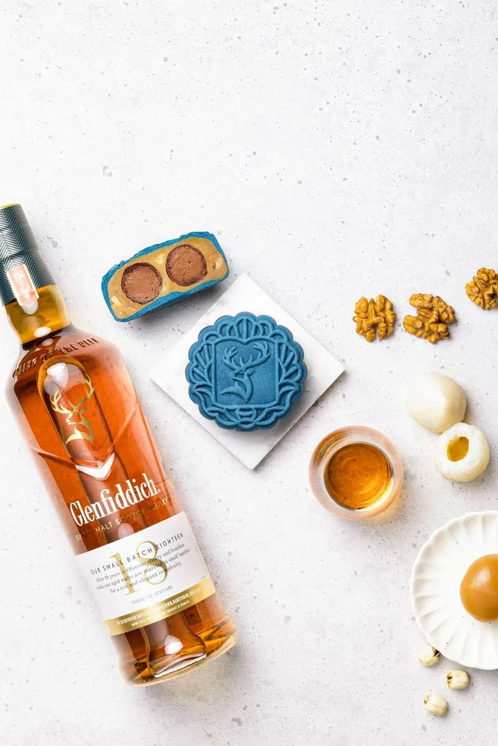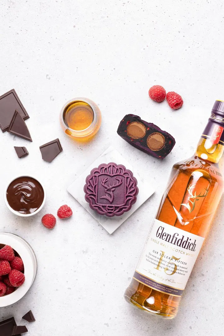 威士忌品牌Glenfiddich再次推出限量款月饼,“Glenfiddich Solera 15 Mooncake”,冰皮外层以黑巧克力和覆盆子制成,内有浓郁的鲜奶油馅和Glenfiddich 15年单一麦芽威士忌巧克力夹心。“Glenfiddich Small Batch 18 Mooncake”,则以荔枝和核桃作为馅料,包裹着融入Glenfiddich 18年单一麦芽威士忌的巧克力夹心。可选择单购买月饼(两粒装)或附有一瓶“Glenfiddich 15 Year Old”威士忌的月饼礼盒。