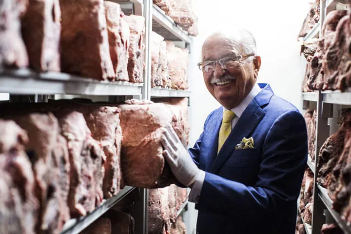 Wolfgang's Steakhouse的创始人Wolfgang Zwiener在餐厅内设的恒温恒湿的干式熟成室中。