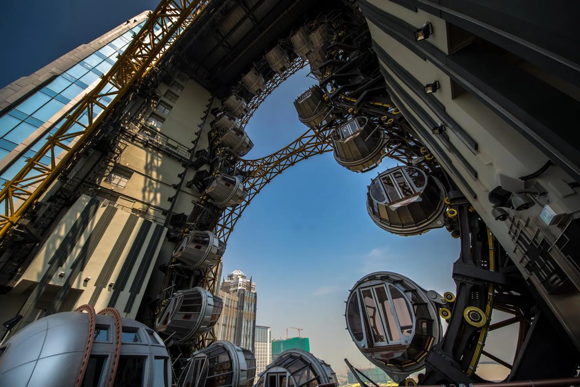 摩天轮高悬130米,耸立于两座酒店大楼之间,大老远就可以看见。设计概念源自好莱坞电影的震撼场景,恍如两颗炽热行星冲击大楼外墙,留下了一个大大的“8”字,鲜明抢眼。摩天轮共有17个以復古科幻为主题的观景厢,每个可容纳10人,观景厢沿着8字型路轨缓缓起伏运转,带来前所未有的摩天轮体验。