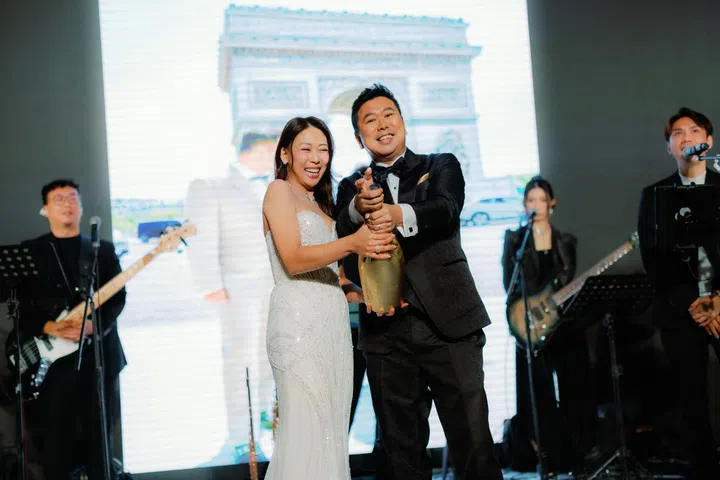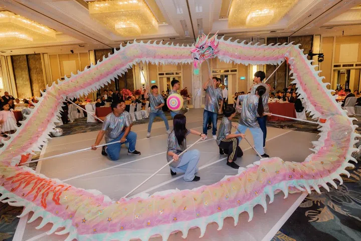 新郎请来他长期支持的醒狮与舞龙队为现场增添喜庆气息,现场乐队则融合经典老歌与现代流行曲,令不同世代宾客都能尽情享乐,气氛延续至晚宴后的派对。
