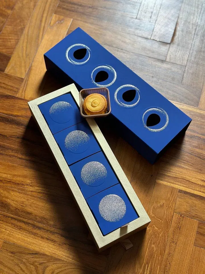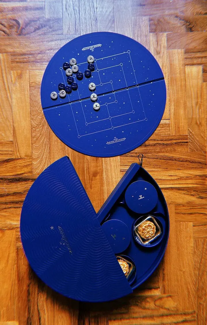 顶级护肤品La Prairie 今年的中秋月饼礼盒,奢华中充满细节。饼合采用品牌标志性钴蓝色,内部双层设计,附赠的跳棋玻璃珠子以钴蓝和品牌护肤品主要原材料—鱼子的金黄色做搭配。