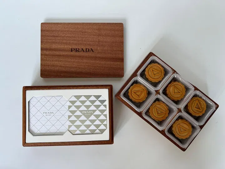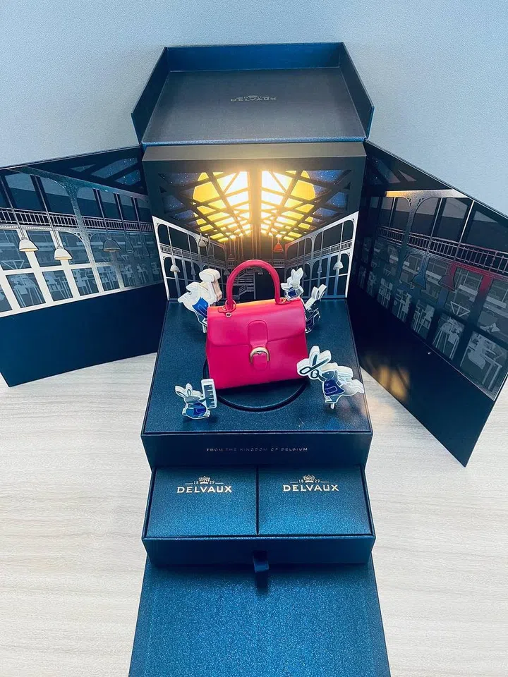 在比利时精品品牌Delvaux的月饼礼盒中,站着4只可爱的中秋月兔,中间则展示着品牌标志性的Brilliant手袋。一抽开下方的月饼盒,后方的背景瞬间亮起,手袋也跟着旋转,令人看得目不转睛。