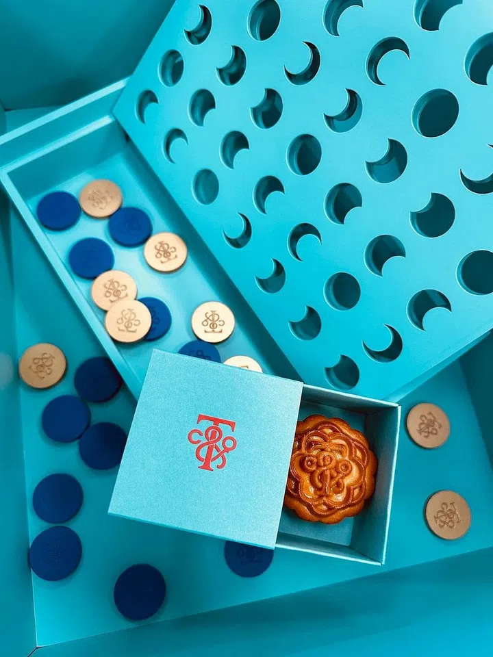 标志性的蒂芙尼蓝,一眼望去就知道是哪个品牌的月饼礼盒。盒子上印有蒂芙尼(Tiffany & Co.)Schlumberger珠宝系列的动物和花卉造型图案,盒内除了盛放印着由“T、&、Co”形成的独特标志,还附上特别订制的“Connect 4”游戏,让你欢乐过中秋。