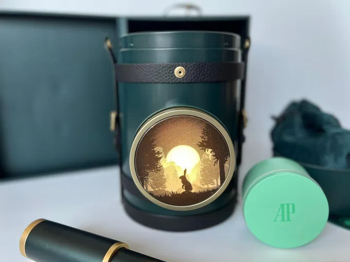 爱彼(Audemars Piguet)延续往年的灯笼概念,绿色盒子配有可更换的滤光片,每一片的设计均呈现不同风景。配合“A journey to the moon”主题,礼盒内还装有单筒望远镜,让你清晰地观赏到月亮的细节。