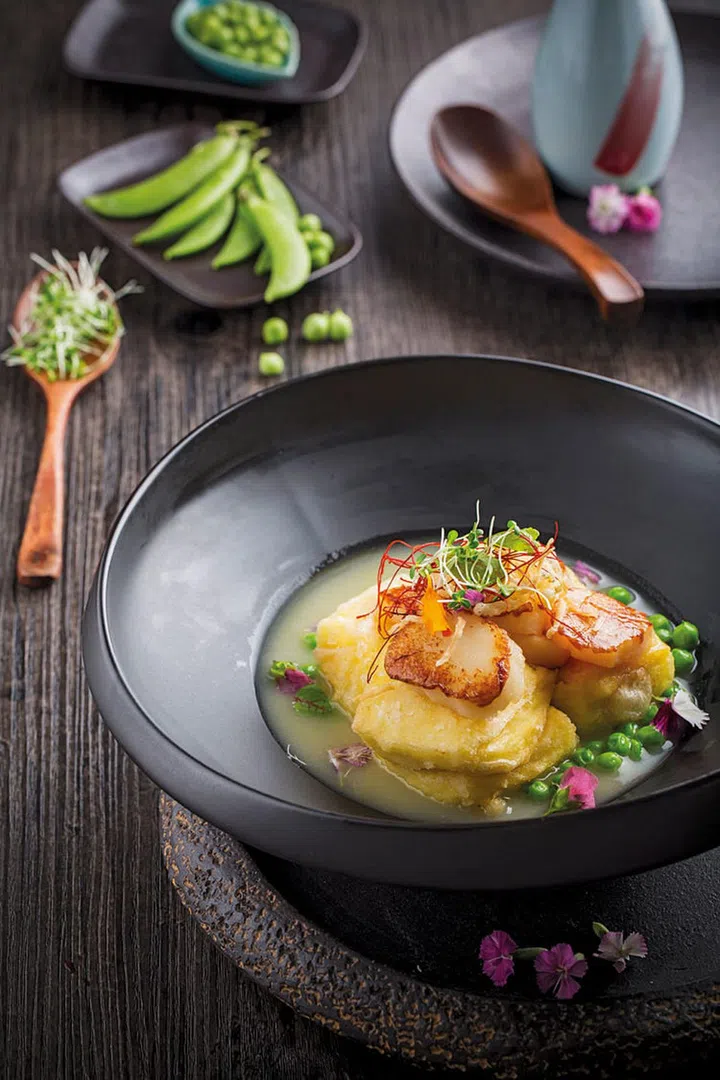 艺yi by Jereme Leung的Pan-seared Scallops with Crispy Chicken Consomme and Green Peas