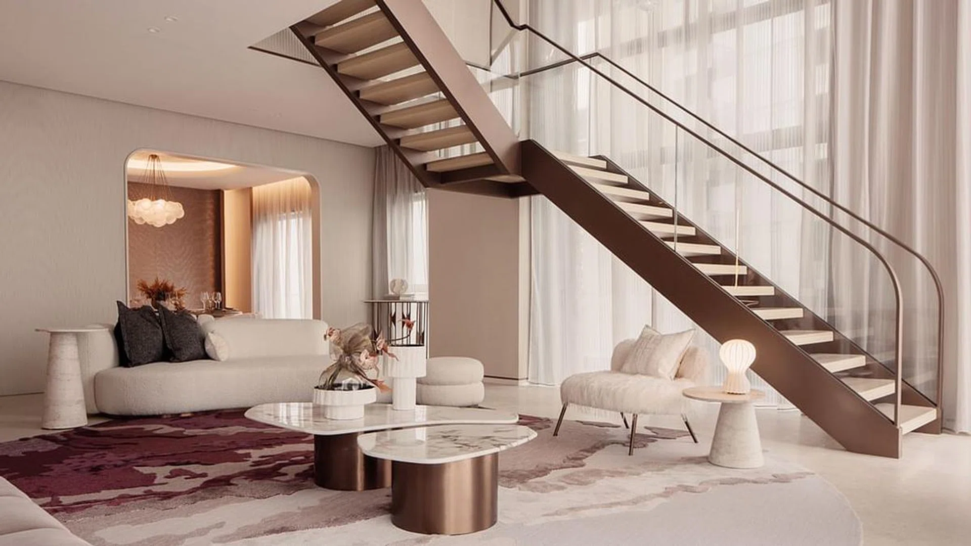 “尽管这两个单元的设计皆从大自然汲取灵感,空中绿洲的客厅灵感来源于瀑布,椭圆形楼梯展现如水般的流线形态,圆弧形的中性色调沙发就像是鹅卵石。花影别墅则借境生气盎然的春天,精致玻璃吊灯如同盛开的花朵。”