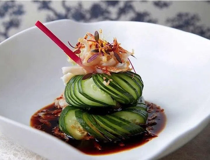 另一个好例子是“蓑衣黄瓜”。“这是北方人夏天吃的地方菜,我必须用手工把黄瓜切划成多个‘环’而不能断裂,再加上冰块,每一口都是爽脆。我把酱汁稍作调整,以蚌类、海苔和醋腌制而成。”