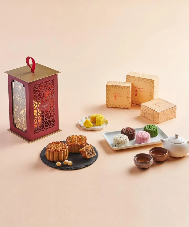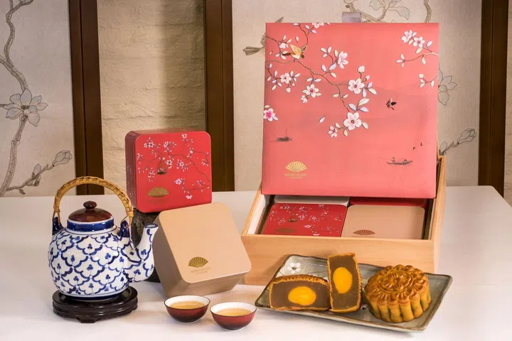 新加坡首都凯宾斯基酒店的双层月饼盒以鲜艳夺目的红色为主,外观绘上酒店附近的地标Capitol Singapore和CHIJMES Hall的彩色玻璃窗设计。盒子内附有首饰分类间隔,方便你在享用月饼后,把盒子当作首饰盒使用,放上自己闪耀的珠宝。酒店今年推出的传统月饼口味包括迷你香兰瓜子月饼、迷你红豆沙陈皮月饼、迷你白莲蓉蛋黄月饼少糖和迷你白莲蓉澳洲坚果月饼少糖。冰皮口味选择则包括迷你冰皮70%法芙娜巧克力月饼、迷你冰皮海盐焦糖月饼、迷你冰皮荔枝玫瑰月饼及迷你冰皮猫山王榴梿月饼。