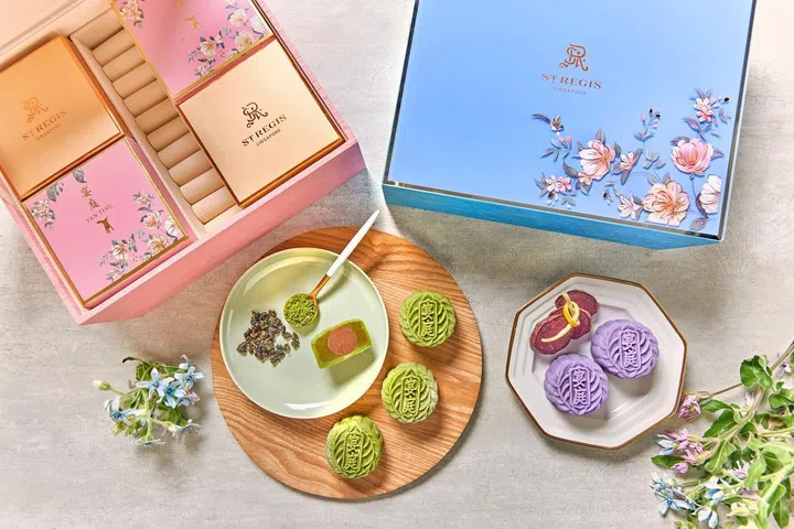 瑞吉酒店旗下中餐馆宴庭的月饼包装以柔和的粉彩色系为设计重点,搭配美丽花卉图案,非常具有少女心。享用完月饼饼后同样能够将盒子循环使用,收纳珠宝首饰或各种小物,既环保又实用。月饼口味这次主打以茶为主题,选择包括皇室奶茶蜂蜜桂花、绿茶乌龙茶。当然还有其他创新口味如蜂蜜紫薯⾹橙柚⼦冰⽪⽉饼及⿊芝⿇焦糖海盐。
