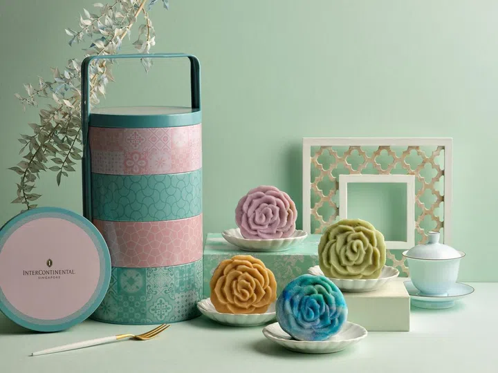 新加坡洲际酒店今年的冰皮月饼以经典的娘惹甜点为特色,四种口味选择有:煎蕊(Chendol)、椰糖(Gula Melaka)、红豆椰子和香兰冻(Pandan Jelly)。每一个月饼以满福苑招牌的盛开玫瑰花轮廓为造型,美得让人舍不得吃下肚。月饼装在同样富有浓浓娘惹风的浅粉色和绿松色“Tingkat”盒(圆形多层饭盒),中秋节过了以后还可以用来打包食物带去野餐。