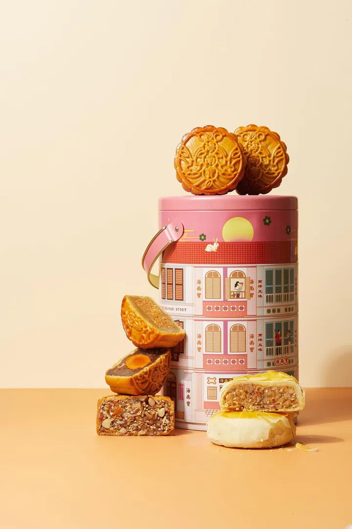 海南宝首次推出月饼,自然少不了海南传统风味。月饼礼盒以4层圆筒铁罐包装呈现,内含4种不同口味月饼,有传统的咸五仁月饼(Salted Mixed Nuts),以及两款极富本地特色的口味:海南宝咖啡单黄核桃莲蓉月饼(Hainanese Kopi Walnuts White Lotus with Single Yolk)和椰糖莲蓉月饼(Coconut Gula Melaka and White Lotus)。根据祖传配方制作的传统海南味月饼(Hainanese Traditional Savoury),内馅由橘皮 、炸葱、芝麻、瓜子等13种配料制成。