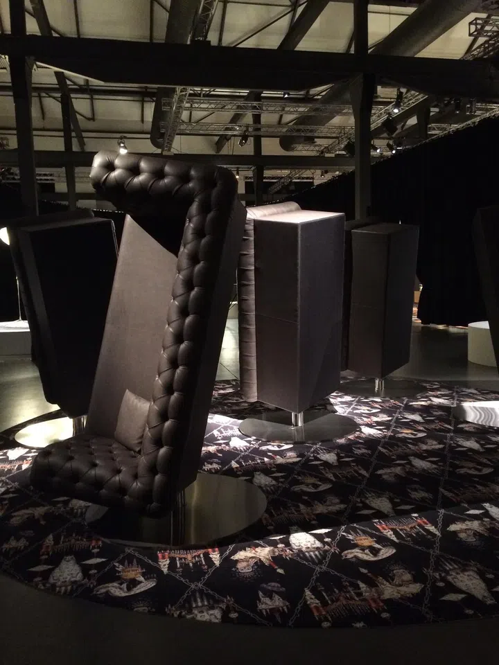 地毯是Moooi近年来主打的新系列作品,今年的设计以缤纷花色为主。今年品牌的办秀方针是将会场中央展示新作,吸引观众趋前欣赏,营造打造一个设计社群。另一方面,品牌许多旧作都展示在周边的几个空间,并以奇幻手法进行布置。