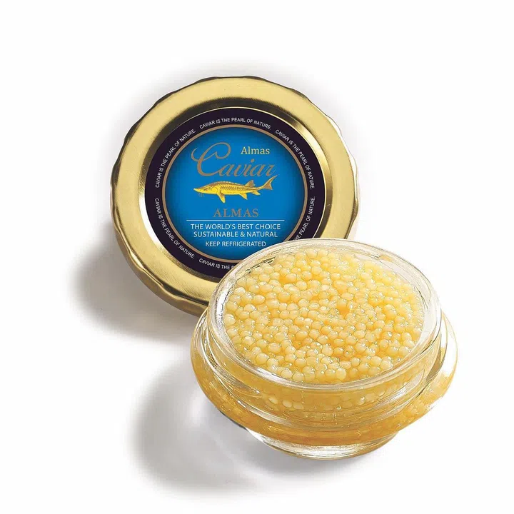 鱼子酱是众所周知的顶级食材,在高档餐厅中尤为常见。各种鱼子酱中,以Almas最为珍贵,身价非凡。Almas也被称为黄金鱼子酱或白鱼子酱,由极为罕见的白化贝鲁迦鲟鱼鱼子制成。在古老的波斯语中,Almas意思是“钻石”,其鱼子酱的颜色取决于鲟鱼的年龄大小,多为金黄或浅灰色,与一般贝鲁迦鲟鱼子酱的暗黑色泽,形成鲜明对比。享用Almas鱼子酱的最佳方式,是不配搭任何其他食物,纯粹单吃,将鱼子酱直接放在拇指和食指之间的手背虎口处,让体温将鱼子酱微微温化,再送入口,细品其香醇甘美的滋味。
