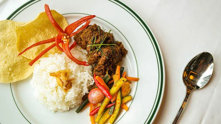 高档牛排馆也在国庆日期间提供新加坡美食,以餐馆著名的美国高级黑安格斯牛肉做出仁当风味,搭配白饭与阿渣,呈献非一般仁当牛肉饭。
