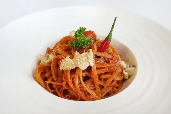 国庆日当天推出五道式晚餐,包括清新番茄与杏仁、鲍鱼、tagliolini意大利面、主菜为宫崎猪肉,最后是红豆与椰子甜品。重点是,餐馆天台可看到新加坡河烟花。