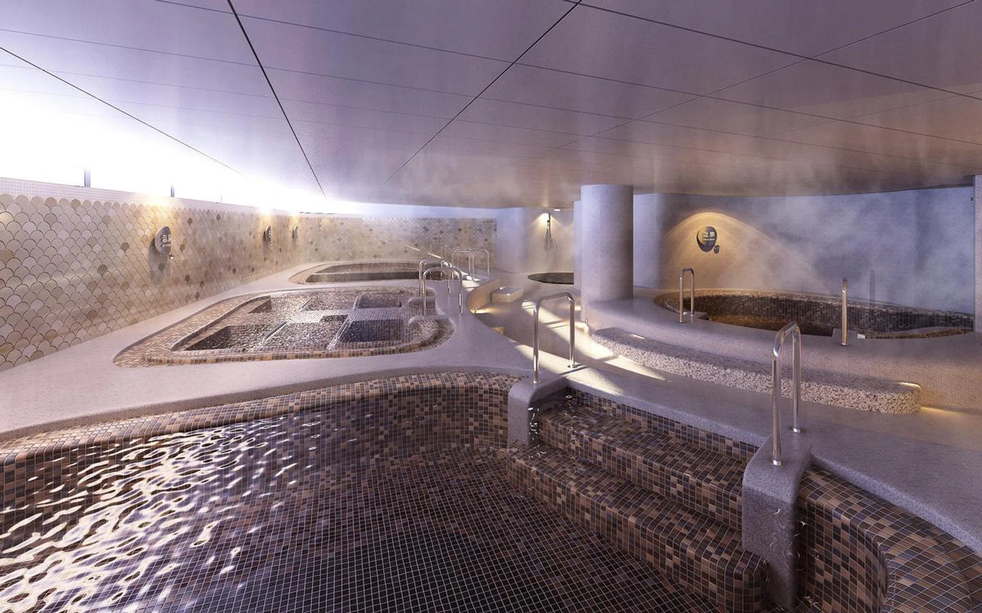 中心占地1万6,000平方英尺,共有11个水池,有6种不同的池水,还有其他设施如桑拿、蒸汽浴、按摩与水疗室、淋浴处、餐厅、休息厅、储物设施以及为旅客而设的行李礼宾服务。