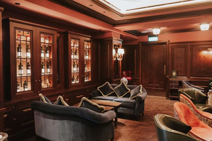整个空间的核心是装有来自42个国家的5000多款优质葡萄酒、高达6米的落地葡萄酒塔。酒单之全在东南亚居冠,其中约1000款葡萄酒可按杯点,涵盖经典名庄的垂直年份到无数小众产区的优质酒酿。会员还能将心爱的酒寄存在俱乐部的酒库,让酒酿在长年维持12摄氏度的恒温下永保新鲜。正对面的“威士忌墙”也毫不逊色,陈列着430瓶威士忌珍藏。28楼隐藏着名为“Naughty Corner”的空间以及威士忌酒吧,这一私密角落曾是顶层公寓的卧室,可容纳35位客人。酒吧台、墙壁和橱柜皆以樟脑木覆盖,此木自带一种自然镇静气味,据说可以降低心率,与手工制作花卉图案天鹅绒内饰相得益彰,给人舒适温馨的感觉,很适合与三两好友把酒言欢。