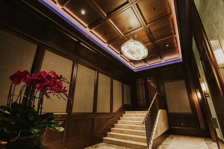 如今,Grant Ashton将其改头换面,室内设计以20世纪20年代和30年代上海艺术装饰(Art Deco)风格为灵感,大量运用大理石、定制的手绘和丝绸手绣墙纸、实心胡桃木墙板,打造气派又时髦的环境。在赋予新鲜面貌的同时,67 Pall Mall团队也保留了这所旧私宅富有历史与纪念意义的物品,例如大厅接待处的1970年代大型水晶吊灯,邵氏兄弟与来自世界各地名人的合照、私人派对和影展活动照、复古电影海报、印有邵氏logo的餐具等等。