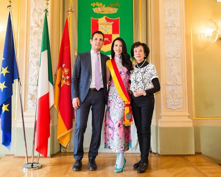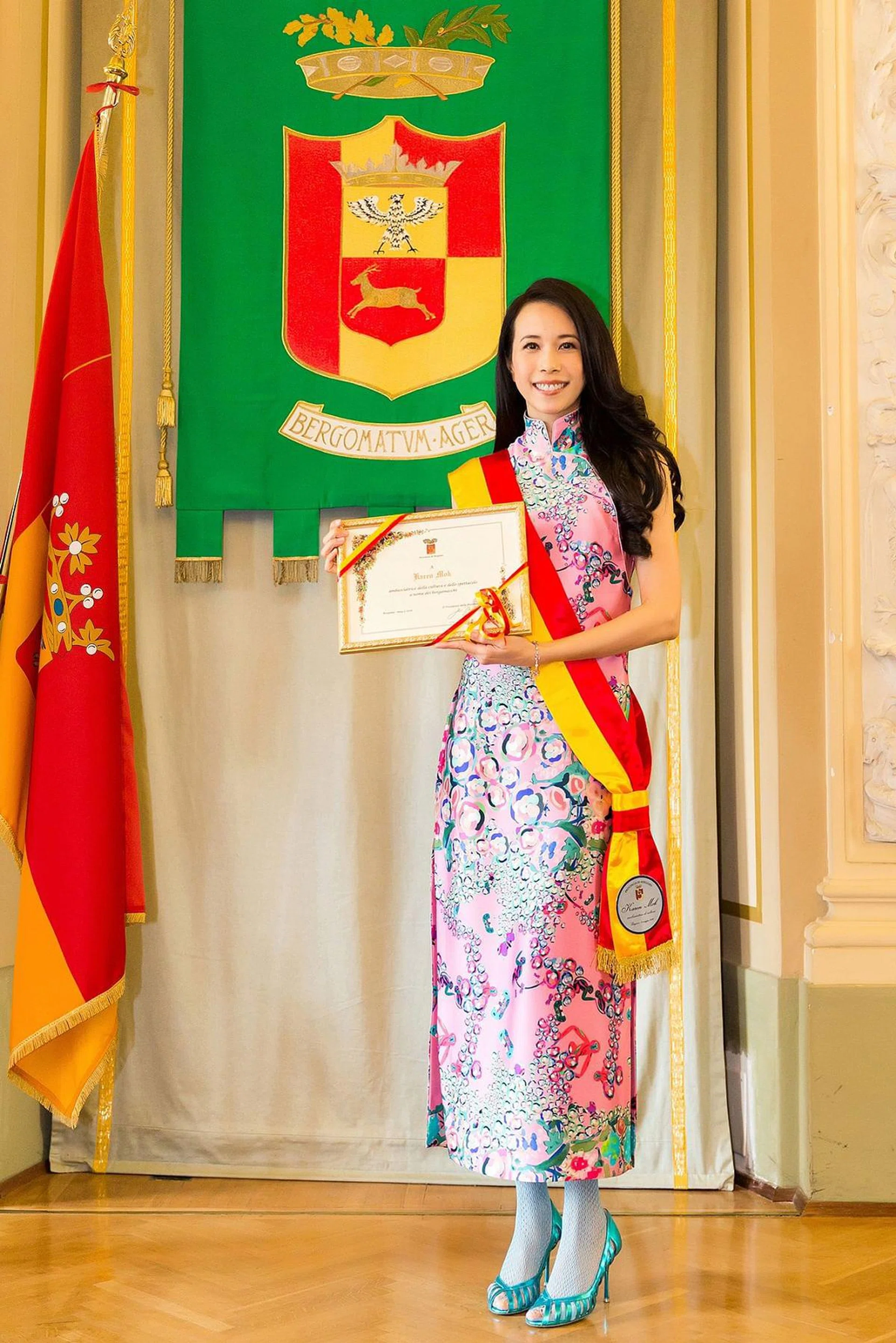 生活Pop star Karen Mok is now cultural ambassador for Bergamo, Italy/莫文蔚受封贝加莫“文化大使”莫文蔚 凭借“看看世界”巡迴演唱会唱红欧洲,并因此被誉为“东方麦当娜”。日前,她又再次受封成为意大利贝加莫省“文化大使”,彻底达成用音乐征服世界的梦想。(点击内文视频,观赏莫文蔚受封仪式)文 / 赵璐 / 6 May 2016Karen MokShare this article “音乐鬼才” Mika担任莫文蔚米兰站演唱会嘉宾,中西巨星合唱《Stardust》。 莫文蔚“看看世界”巡回演唱会于台北小巨蛋起跑,跑遍了各大城市,上月来到狮城开唱。之后便马不停蹄赶赴欧洲,5月1日在米兰展现她独特的舞台魅力。各大欧洲媒体都争相以头版报道莫文蔚的巡演,并给予极高评价,她也因此被誉为“东方麦当娜”,并达成了用音乐征服世界的梦想。除了“东方麦当娜”,如今她又多了一个荣誉头衔,被意大利贝加莫(Bergamo)省授予“文化大使”称号。米兰站演唱会后的隔日,莫文蔚一早前往意大利贝加莫省,在政府大楼完成受封仪式,贝加莫省长、市长与文化局长等人亲自接待。莫文蔚以一袭亮丽的粉色旗袍出席仪式,获颁贝加莫“文化大使”证书奖章,并佩戴黄红色相间的彩带,象征贝加莫省至高荣誉。 Play 欧洲流行乐天王Al Bano Carrisi也到现场参加莫文蔚的受封仪式,并获赠她的专辑。“文化大使”称号象征对艺术家与音乐人杰出成就的赞赏与肯定,继20世纪最伟大歌剧女王Maria Callas、世界三大男高音之一Luciano Pavarotti和全球乐坛传奇人物Elton John之后,莫文蔚荣登贝加莫国际艺术榜单。仪式上,她用流利的意大利语发表感言:“能来到这个城市我感到非常荣幸荣幸,从 17岁到这里读书,在这里遇到初恋,然后在这里举行婚礼,意大利在我心中占据重要位置。也非常荣幸能成为第一个在意大利开演唱会的华人歌手。”此外,欧洲家喻户晓的流行乐天王Al Bano Carrisi不仅现身观赏莫文蔚“看看世界”米兰站演唱会,也到现场参加她的受封仪式,一起见证历史性时刻,莫文蔚还送上首张英文爵士专辑《Somewhere I Belong》表达感激之情。此趟欧洲之形,她的妈妈何敏仪和老公Johannes更是全程爱相随。 此趟欧洲之形,她的妈妈何敏仪和老公Johannes更是全程爱相随。 Read More:Here’s what style icon Karen Mok wore for her recent Singapore concert /莫文蔚演唱会的精彩服装Karen MokShare this article