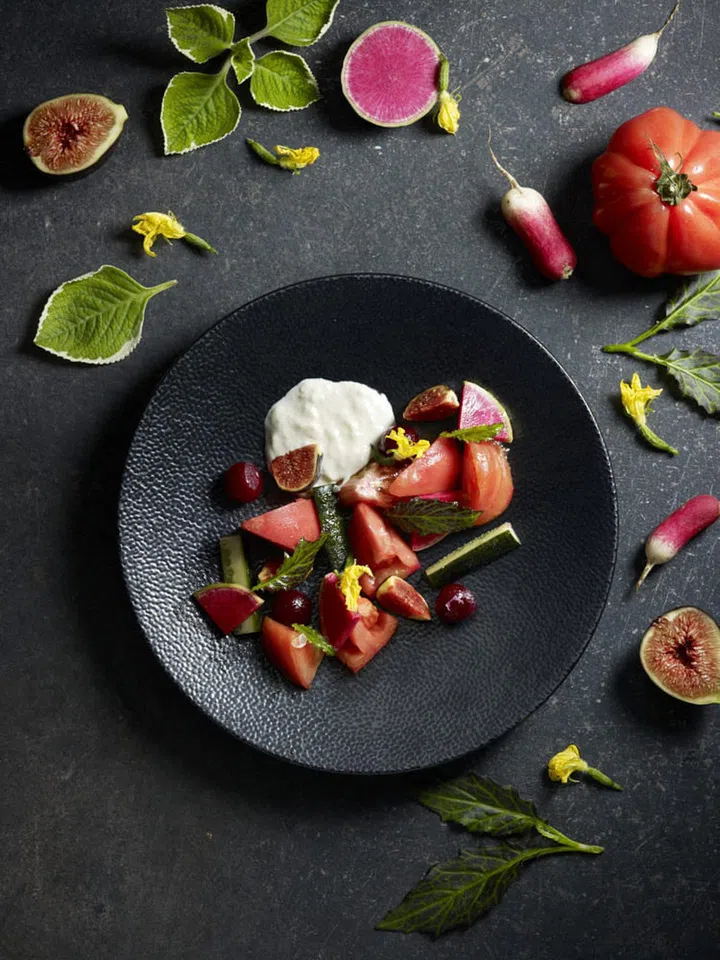 烟熏的沙丁鱼采用日本的沙丁鱼被烟熏之后被浇上了杏仁汤(Ajo Blanco),与炸得酥脆的黑猪肉仪器入口,还有巨峰葡萄和来自西班牙南方的小番茄平衡沙丁鱼和炸黑猪肥肉可能带来的油腻感。