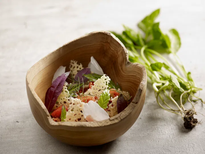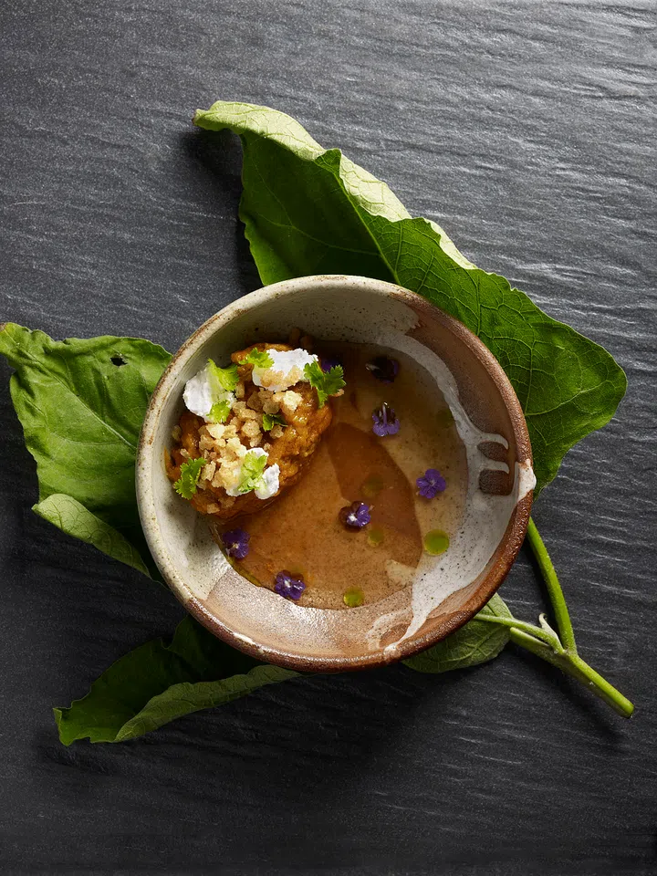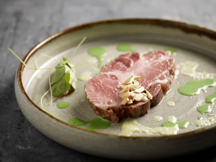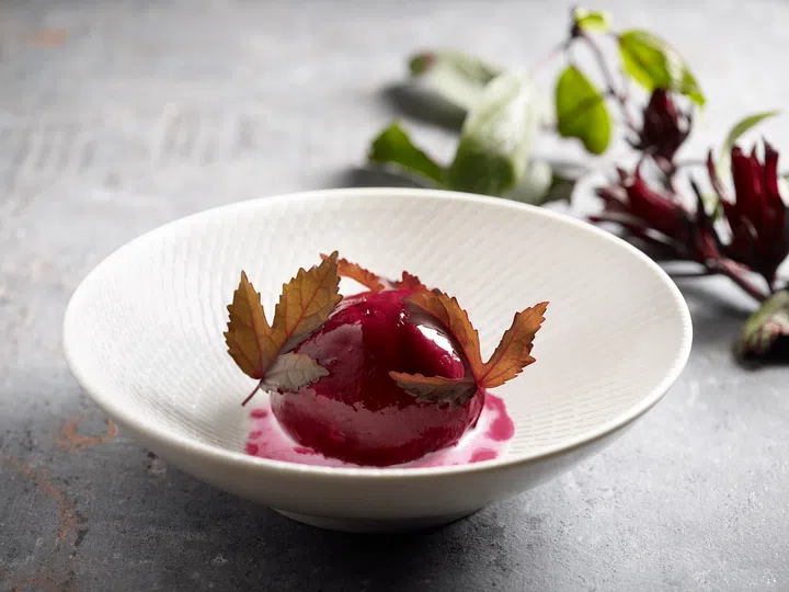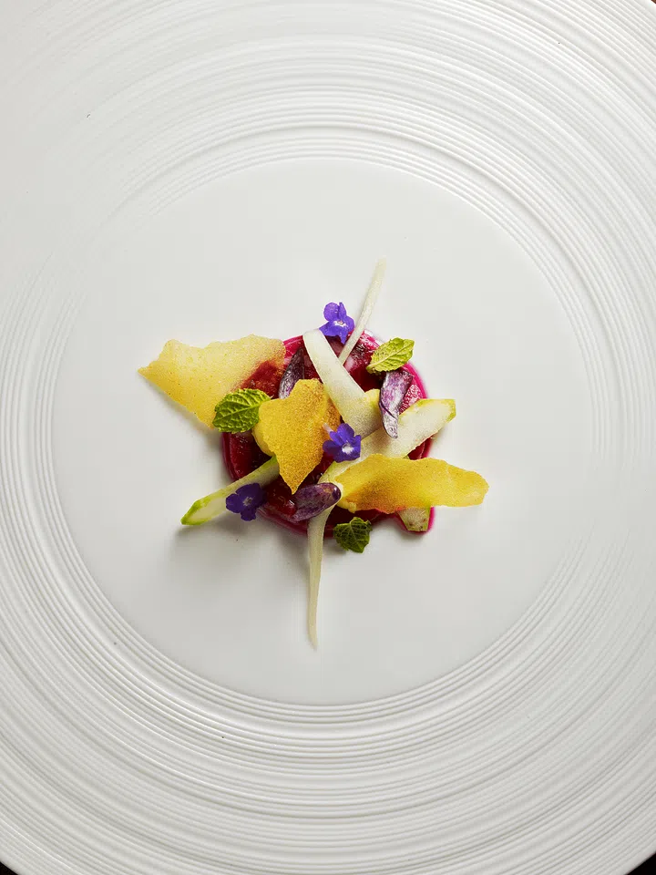 二楼的同名餐厅由米其林一星餐厅Alma的前副主厨Florian Ridder掌勺,在来到新加坡前,他还在德国的米其林一星餐厅Piment与米其林三星餐厅La Belle Epoque工作过。餐厅主打从农场到餐桌的理念,采用本区域农场季节性新鲜食材打造当代料理。菜肴看似简单却充满惊喜,一道简单的甜菜根,你却不知它暗藏着什么样的“心机”。切开来,中间的乳清奶酪与薏仁便流出来,味道香浓,薏仁被炒得酥脆,与甜菜根一起入口,不同的感觉在口中交织,是种享受,这便是我印象最深刻的一道菜肴。