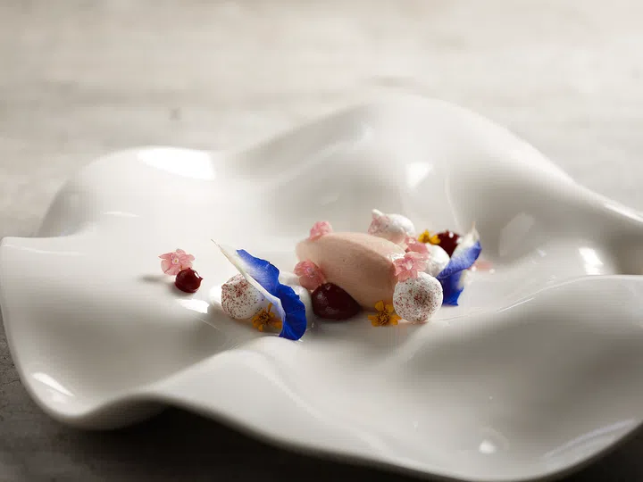 甜点喜欢Flower的清甜口味,番石榴酸奶冰激凌配上荔枝椰子慕斯、树莓酱以及玫瑰蛋白酥,不同水果的味道并不冲突,混合在一起又别有一番滋味。