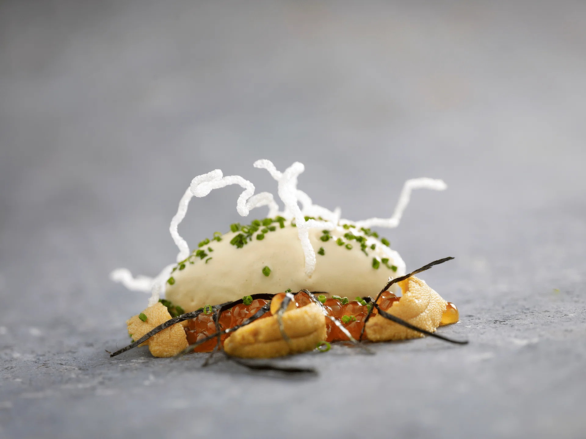 前菜的Uni Pasta,海胆做成的冰淇淋配上鲑鱼卵,撒上紫菜,让你感受大海的清新。Kelong Rojak利用奎笼渔场的鲜虾配合罗惹粉、泰国罗勒、开心果与柠檬,是道完全受东南亚启发的菜肴。我很喜欢Iberico Pork,经过72小时的低温烹调的猪颈肉非常松软,肥瘦均匀口感达到最佳,搭配柠檬奶油洋甘菊洋葱与雪芹酱,即便是荤菜也不会给你太过沉重的感觉。