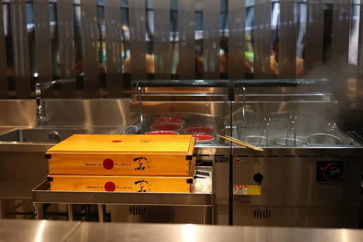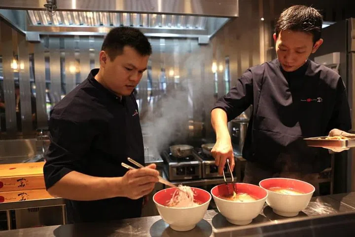 首先,对这家海外第一间分店的印象就是:它比位于东京市郊巢鸭区的本店要大了许多,所谓“大了许多”的意思就是座位从10个增加到了18个,厨房看起来也比日本的本店要宽敞了一些。18个座位均是围绕厨房而设。在这里,你可以亲眼见证米其林星级拉面的整个制作过程,并与厨师进行近距离交流。除此之外更值得一提的是,在店门口与就餐区中间多了一个等候区,设有座椅,并与东京本店一样安装有点餐机,厨师亲自为我们示范了如何用其点餐。至少可以不用在店外风吹日晒地排队吃拉面了,而且点餐机大大提升了厨房的效率。