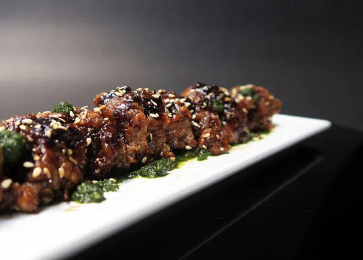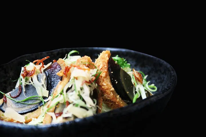 鲈鱼海苔塔可是将智利鳕鱼炸成小圆块,海苔将鳕鱼块和干腌瓜、生姜、麦芽醋蛋黄酱包裹在一起,味道清爽不油腻。还有咖啡猪颈肉,这是煮炒的“美化版”,采用的是黑猪的颈肉,加之酱油、芫荽、叻沙叶松子酱调配,做出来的独特美食。主厨透露,原本是打算用排骨肉,但介于排骨并不适合多人分享,则换成更方便入口的猪颈肉。