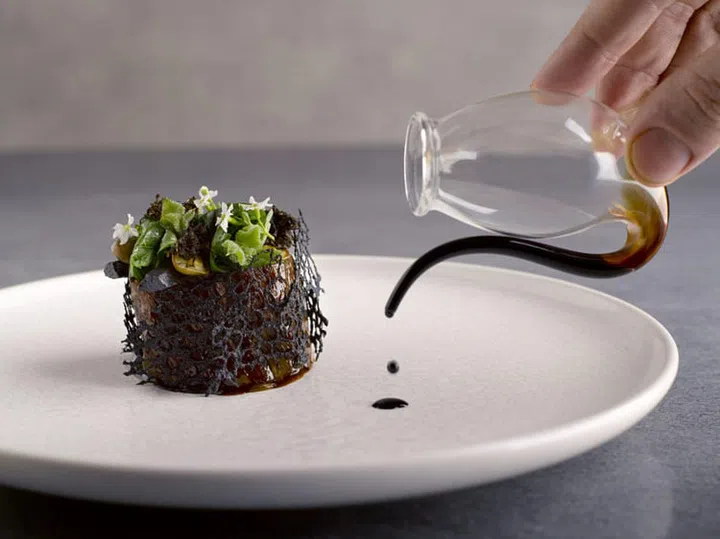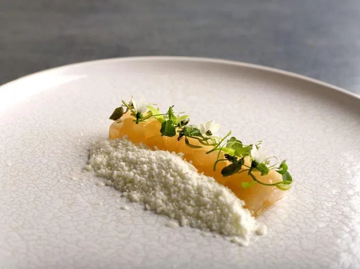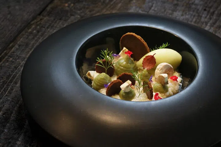 猪肉也是不可缺少的菜肴之一,Slow-cooked Mangalica Pork用盐水烹饪了12个小时,配上白萝卜奶油、手工豆腐与黑苔藓,猪肉与扇贝丝入口即化,口感难以忘怀。