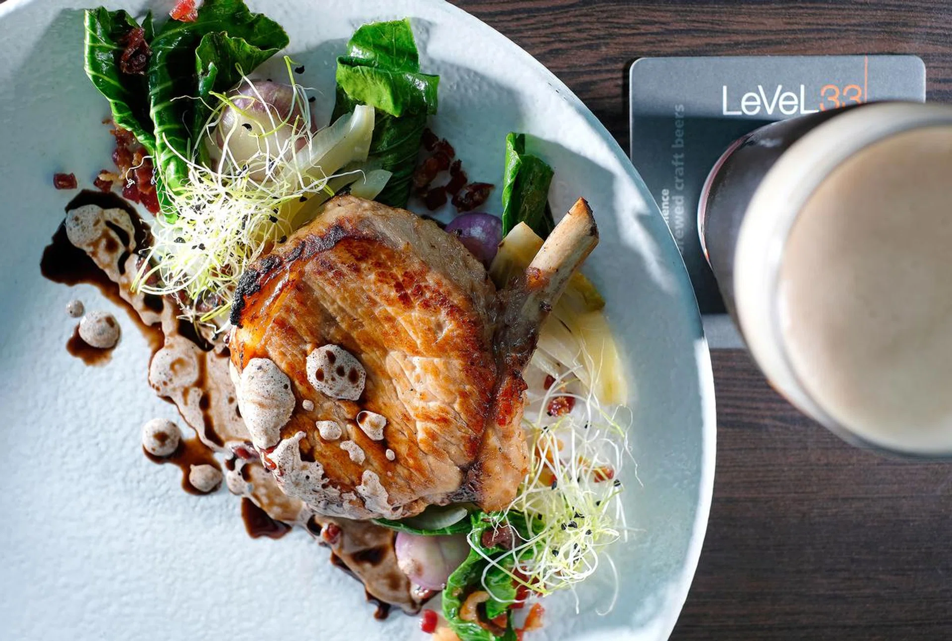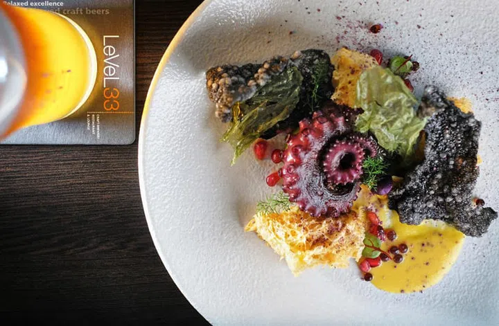 位于新加坡滨海湾金融中心 33层楼的Level33餐厅配合招牌和季节性的工艺啤酒推出全新菜单。 章鱼用红卷心菜、红葡萄酒汁腌整夜,再加上姜、柠檬草,是一道非常不错的钱财。来自弗里曼特尔可持续渔场的章鱼搭配30秒埃斯佩莱特胡椒海面与玉米酱泥,浇上意大利黑醋,还有黑色墨鱼汁木薯片。