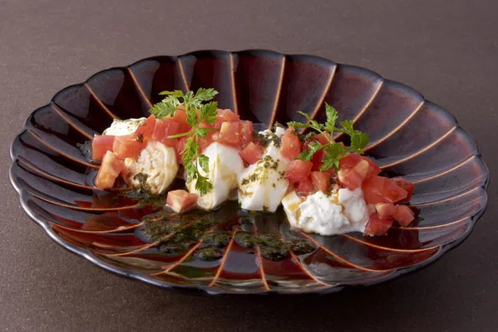 主厨将意大利经典融入日本料理,Burrata奶酪被加上了日本的风味,日本番茄和紫苏叶代替传统的罗勒香蒜酱。木炭烤羊排搭配烤大蒜、迷迭香、麝香草和荷兰芹,完全是西式的风格,但主厨选择用传统的日本烹饪技术来增强这道菜,首先在Teppan Grill上烤制羊肉,然后在炉端烧上烤制出一种烧焦和烟熏的口感。主厨每年回日本四次亲自去农场与渔场挑选为餐厅独家提供的食材。鳗鱼特别来自四万十市,因其天然、清洁和甜的肉而被珍藏。主厨在鳗鱼上添加了来自名古屋的一种百年历史的特殊鳗鱼酱,然后在炉端烧上精心烤制。客人可以选择鳗鱼寿司或者鳗鱼串烧。