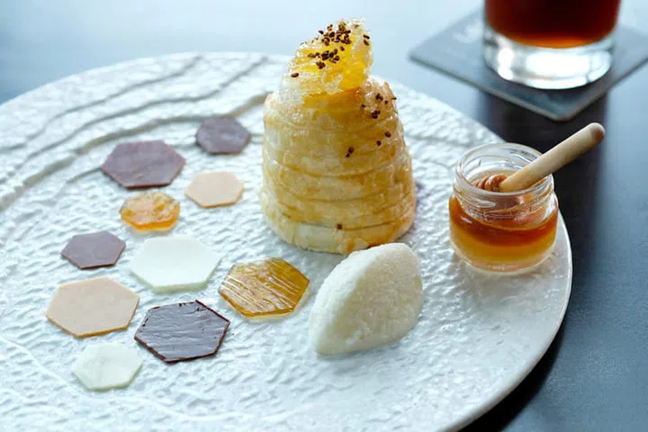 甜品的亮点之一是蜂巢(Beehive),从视觉上就被吸引住,固体蜂蜜、巧克力都被做成了六角形,摆成了蜂窝的形状,从蜜罐中取一勺蜂蜜浇在盘子上,迷迭香味的冰淇淋更为这道甜点增添了不一样的乐趣。