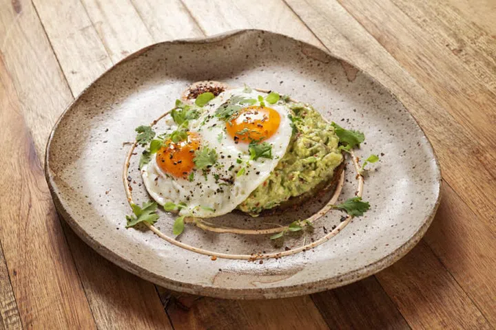 Faina & fried eggs, crushed avocado, coriander & “aji molido” creme fraiche