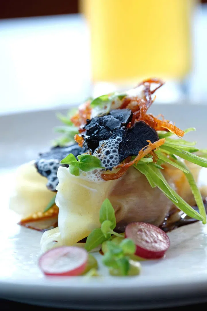 Pierogi是个精致的西式饺子,被牛奶浸的小牛肉和肥肉在松软的饺子皮当中,搭配鳄梨泥、冷腌葡萄和雪豌豆,当中还有松露牛奶泡沫。