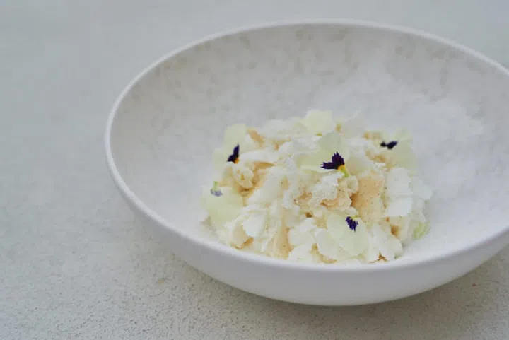 椰子慕斯(Young Coconut Mousse)的灵感来源于一次访问本地水果市场,柠檬酱带来清香的甜味,牛奶饼干、马卡龙、糖碎片还有新鲜的椰子肉,最后再加入可食用的花朵,做成了这道可口的甜品。