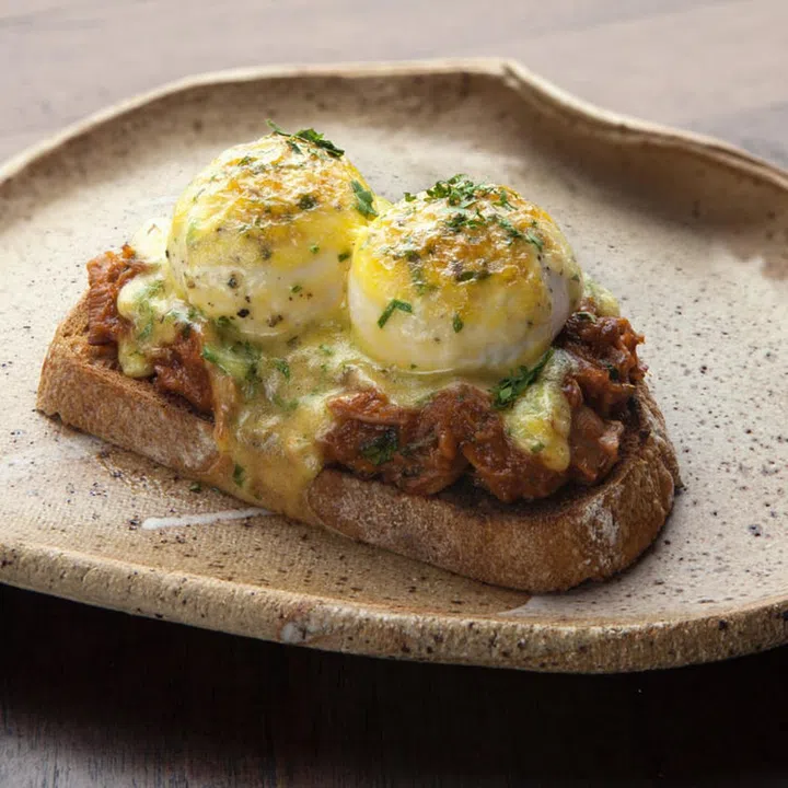 Poached eggs on toast, braised ossobuco & chives hollandaise