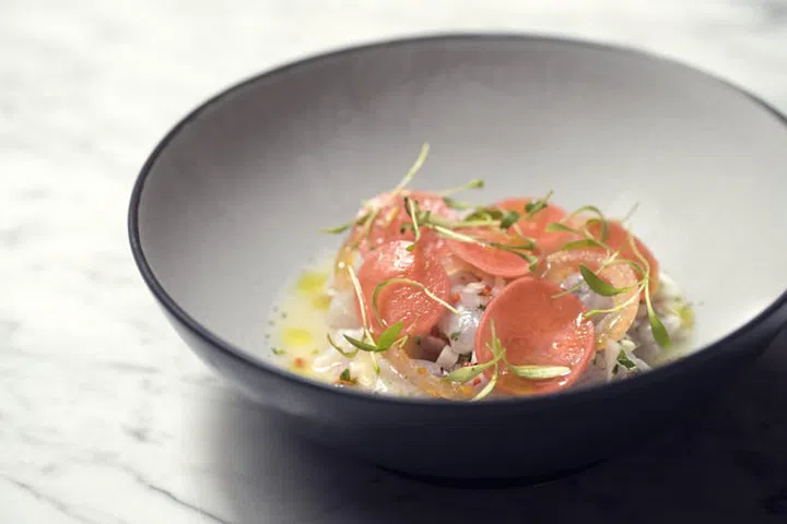 Faina and fried eggs, crushed avocado, coriander and “aji molido” creme fraiche让你感受鳄梨的新鲜口感,而海鲈鱼(Sea bass ceviche, onion, radishes & preserved lemon)让你品味阿根廷海岸线的鲜嫩海鲜。