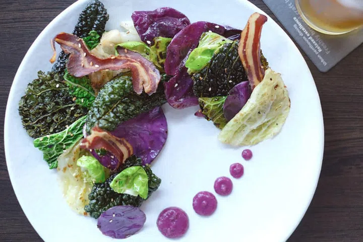 Cabbage、Corn和Leek都是不错的配菜选择,个人非常喜欢Cabbage,从圆角、皱缩的萨沃伊到红叶卷心菜和美丽的布鲁塞尔豆芽的深紫色叶子,烟熏的盐味培根肉口感酥脆,红甘蓝做成的凝胶既增色又添味。