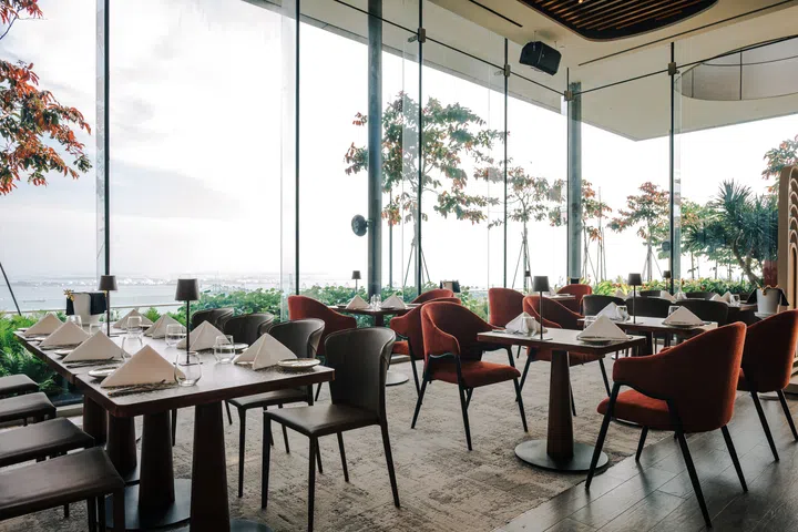 这家标志性餐厅及天台酒吧在今年迎接15周年之际经过一番整修,以全新面貌重新开业,室内设计由屡获殊荣的精品设计事务所 Prospect Design International 操刀,空间分为多个独特区域:一间气势非凡的主餐厅与酒吧、扩展后的私人包厢,以及露天的海景座位区。酒红色木饰与丰富的材质层次为空间注入温暖,点缀的竹制立柱则低调致敬东南亚工艺。吧台以缟玛瑙石材打造,宛如舞台中央的焦点。