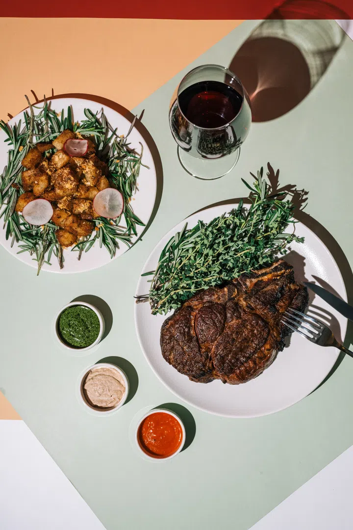 澳洲带骨 Linz 肋眼牛排 (Australia Linz Ribeye on the bone)、香蒜酥粒迷迭香炸和牛牛脂薯块 (Fried Wagyu Fat Potatoes with Garlic Crumbs & Rosemary)