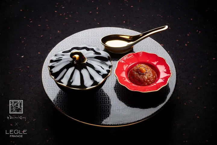 咸鲜味型的开水鸡豆花传承百年,吃鸡不见鸡,彷若浮云飘在清汤之中,可谓是中国引领的“分子美食”。清汤似水,实则经历慢炖吊汤、扫汤三道的步骤,费时近十小时。以食材本味的咸鲜来承上启下,既舒胃舒心。搭配如意系列黑色天目釉温壶器与红色汤碗,均使用宋朝龙泉窑的开片纹,全金如意调羹亦是全手工描绘而成;边缘的弧度、深度容量以中国人的喝汤习惯为设计依归,更显端正闲雅。